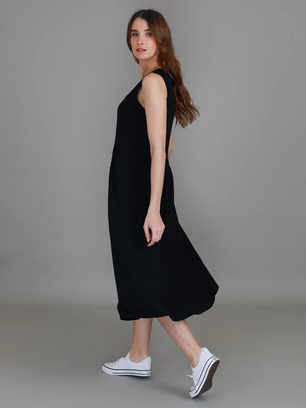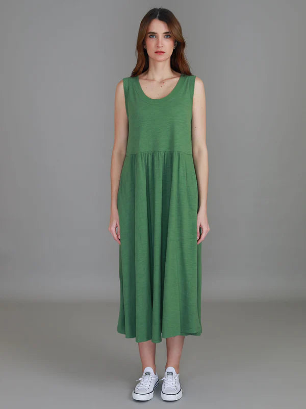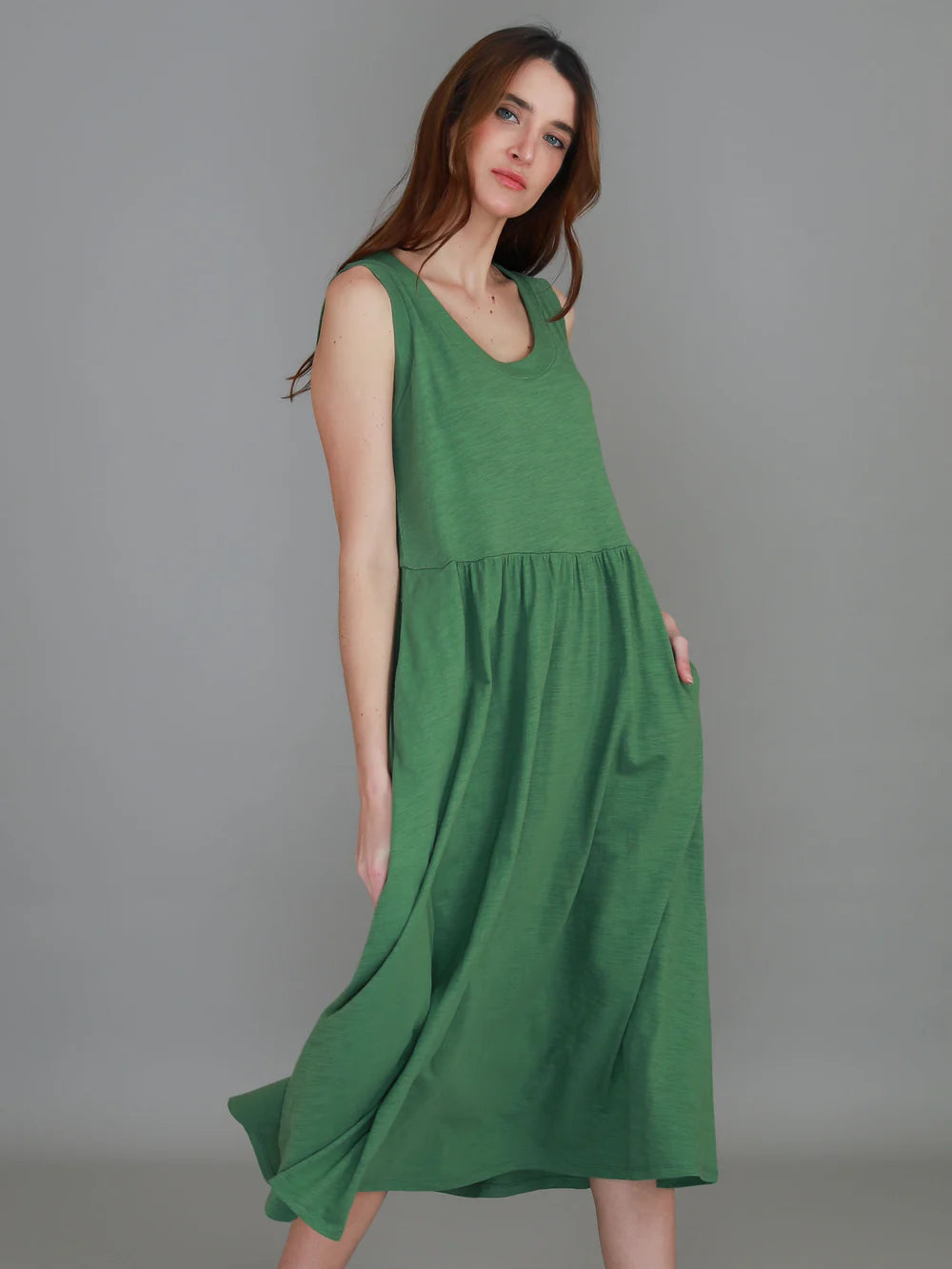 The Purdie Midi Dress is a relaxed sleeveless dress made from soft cotton jersey, designed to deliver both comfort and style. It features a scoop neckline, gathered waist seam, and a flowing midi-length skirt that drapes effortlessly. With side pockets for practicality, this dress is a versatile choice you’ll reach for season after season.