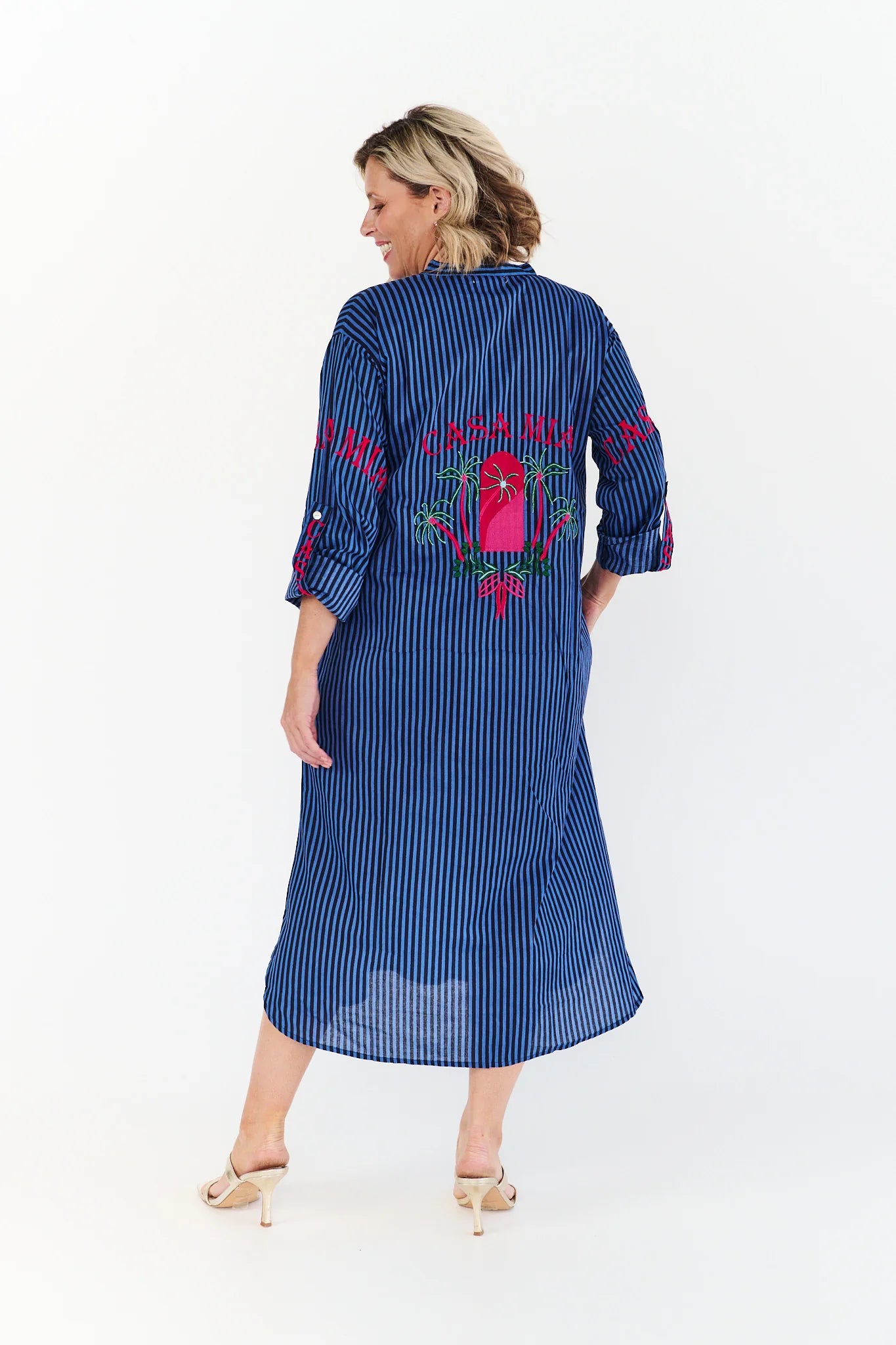 The dress is adorned with vibrant red and green embroidery on the sleeves and across the back, adding a unique and eye-catching detail. With its comfortable fit, three-quarter sleeves, side pockets and subtle side slit, it pairs beautifully with gold heels for a polished look.