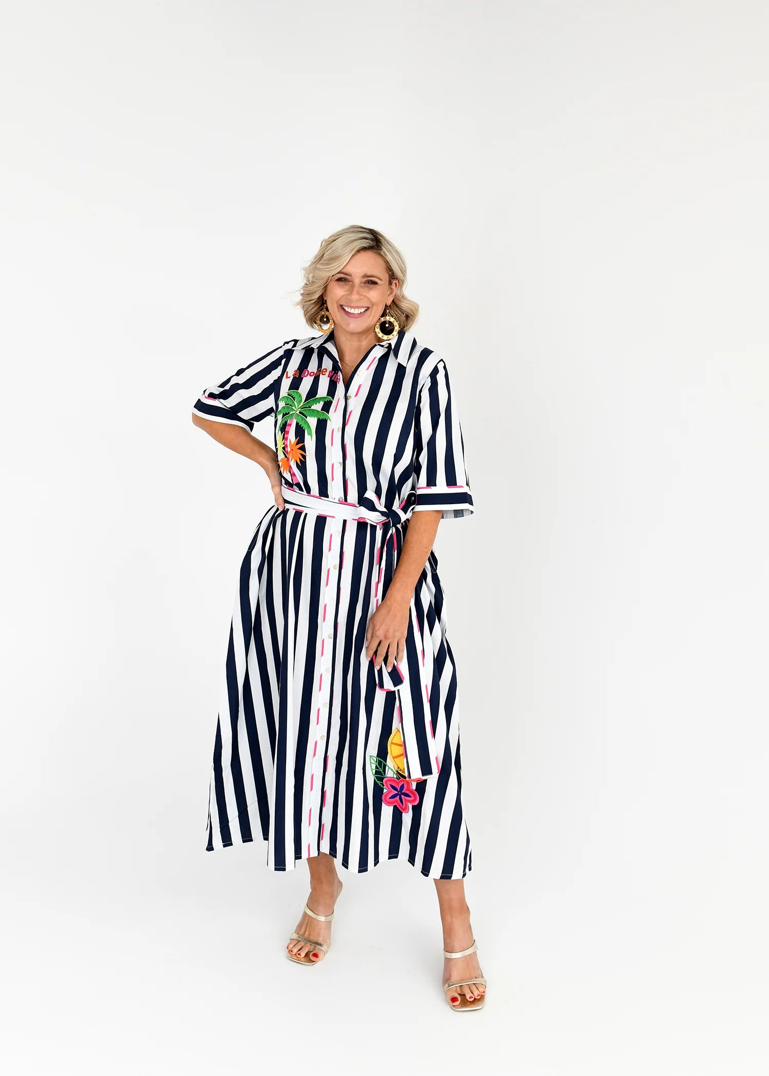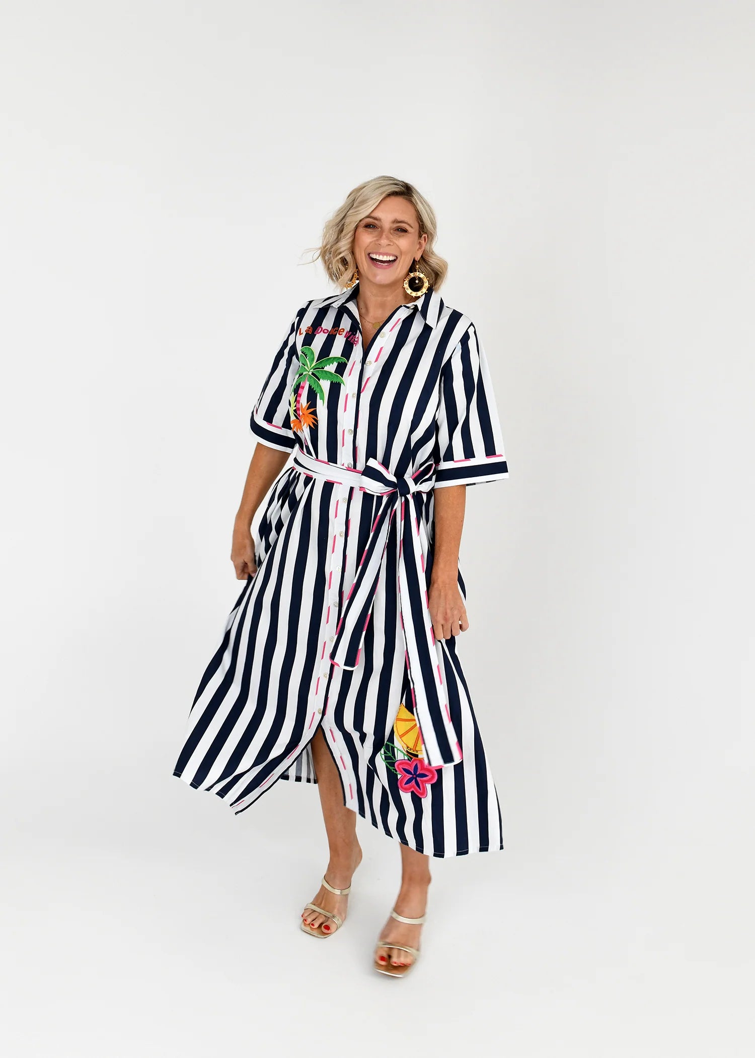 Unleash your inner sunshine with this vibrant blue and white striped dress! Crafted from a lightweight cambric blend, it features a cinched waist with a matching belt, short sleeves, a playful side slit and convenient pockets.