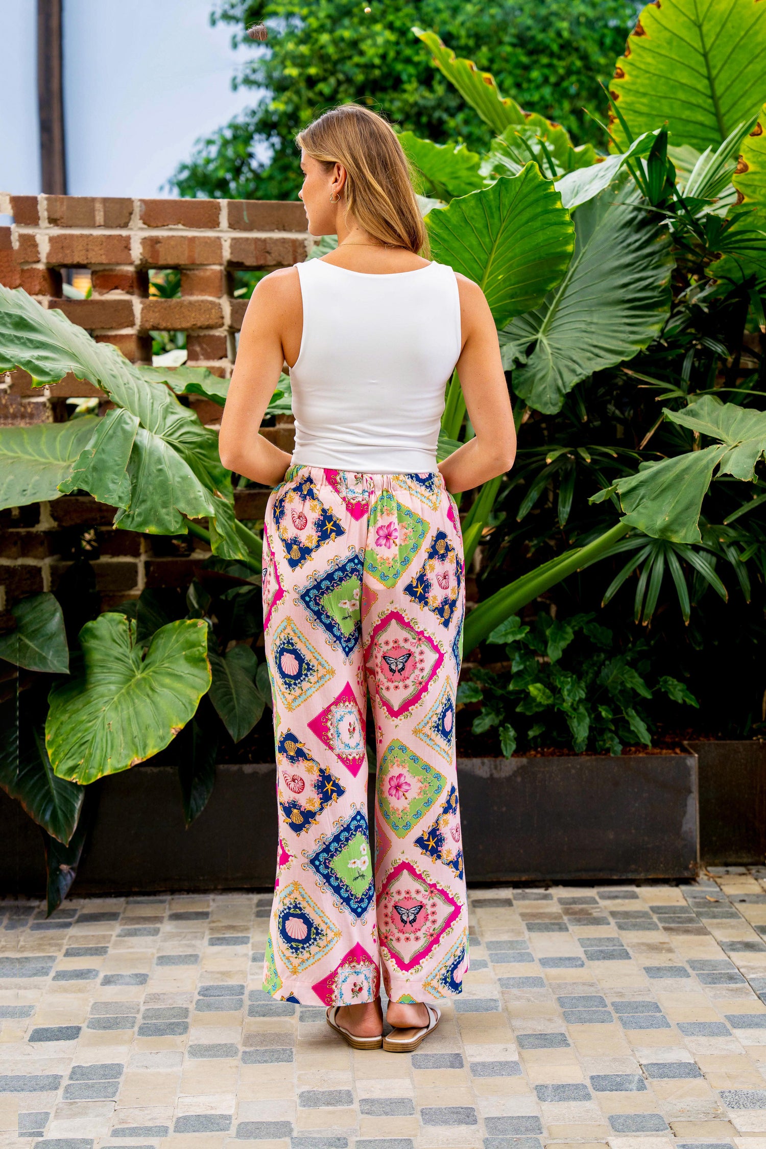Featuring a straight-leg silhouette and loose fit, they provide all-day comfort without compromising on style. The stretch elastic waistband with an adjustable self-tie ensures a flexible, personalised fit, while side seam pockets add everyday practicality. Finished with an exclusive Farfalla patch print, these pants bring colour and charm to any outfit.