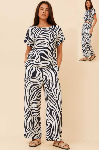 Make a bold statement with this effortlessly stylish two-piece set, designed for comfort and modern appeal. Featuring a relaxed short-sleeve top and matching wide-leg pants, this coordinated look delivers an easy, put-together outfit with minimal effort. The eye-catching all-over abstract print adds a contemporary edge, while the lightweight fabric ensures breathable, all-day wear. The pants are finished with a comfortable elastic waistband and practical side pockets for everyday ease.