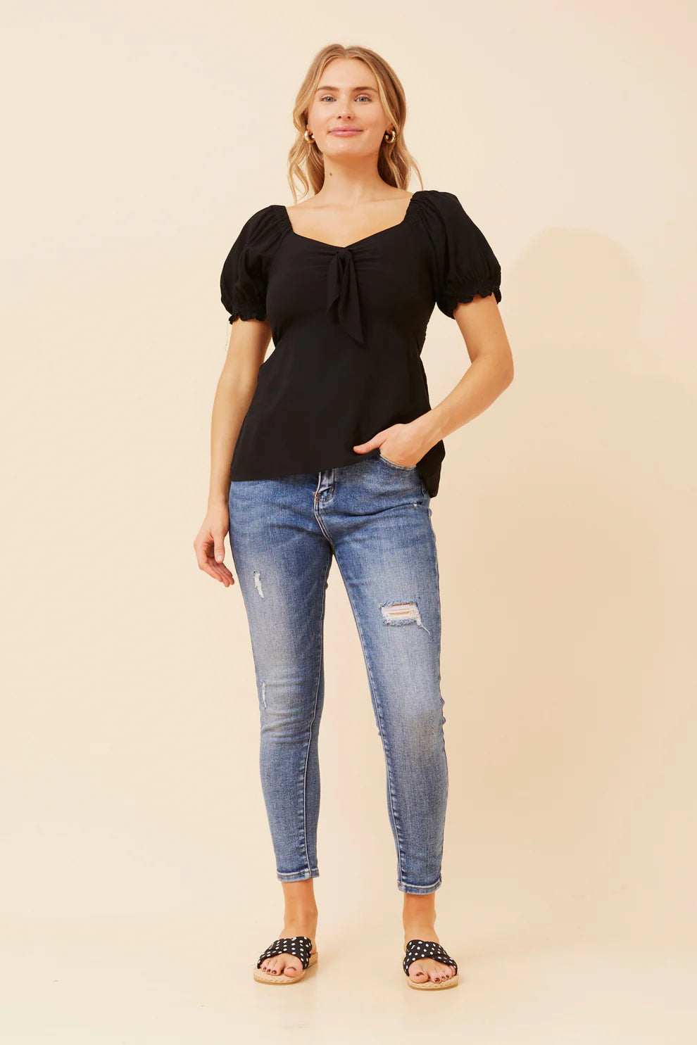 Embrace your playful side with this Bow Front Top, a charming wardrobe essential that effortlessly transitions from day to night. This versatile piece features a striking front bow, elastic back detailing, and delicate short puff sleeves that add a touch of feminine flair. Style it off-the-shoulder for an edgy vibe, or pair it with your favourite skirts or pants for a polished look. Perfect for anyone looking to add a dash of personality to their everyday outfits.