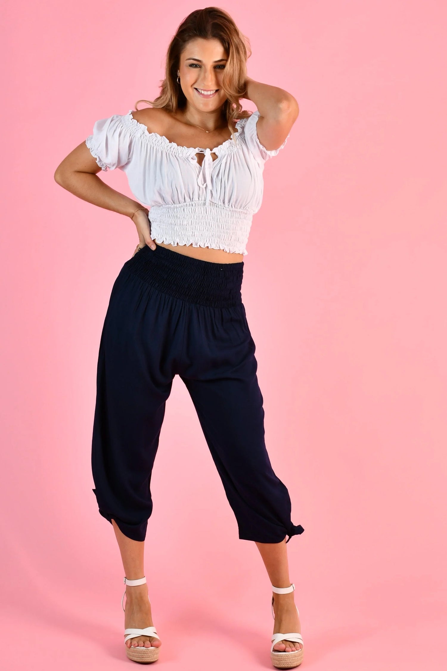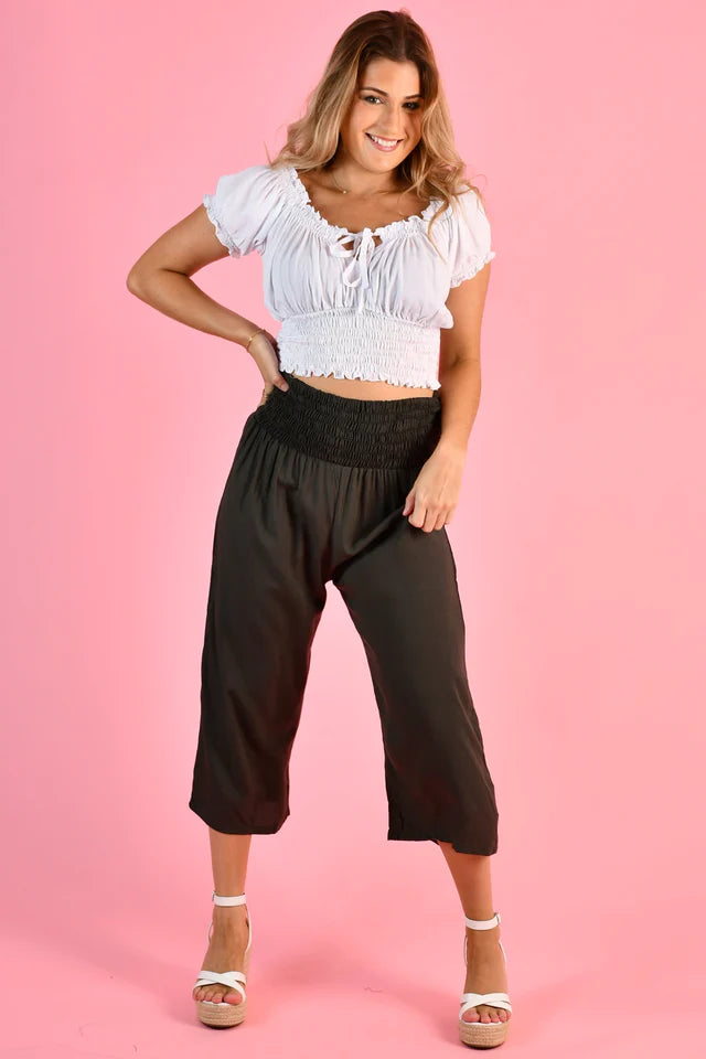 Anyone who has a pair will tell you that they are the comfiest pants around! Made from lightweight Rayon, they feature a stretchy rouched elastic waist and tie bottoms. They are quite generous in the sizing and are an absolute must-have wardrobe essential. They are an excellent option for ladies who like cool comfortable clothing, that is easy to coordinate. They are also a favourite of Mums-to-be as the elastic rouching has enough stretch to accomodate a growing tummy.