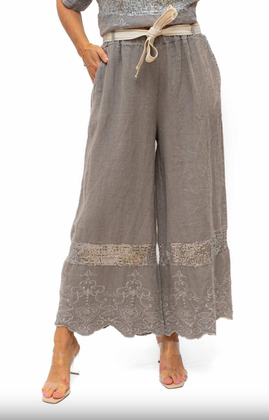 Islip Pant-Linen pallazzo pants with sequin and embroidered hem