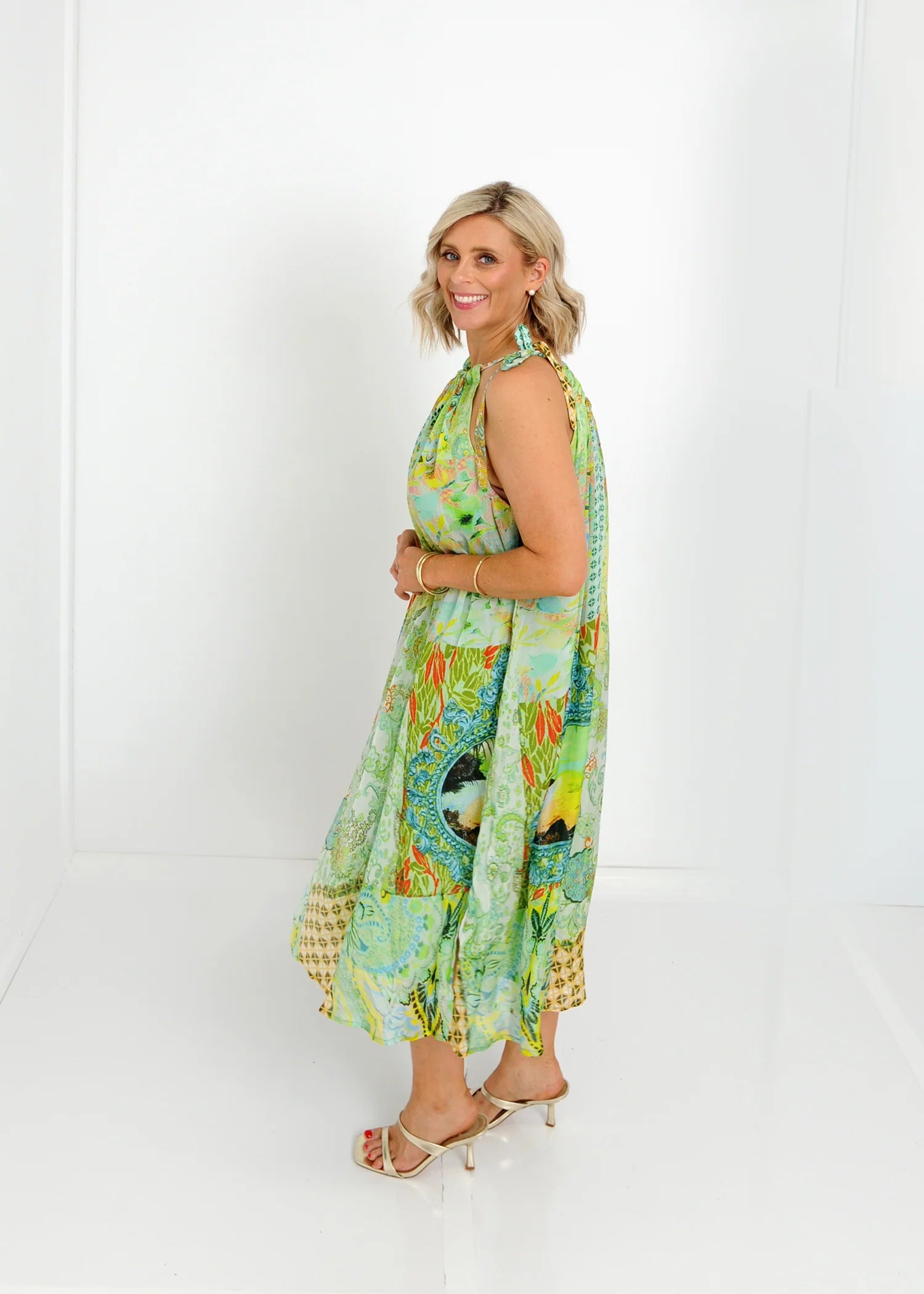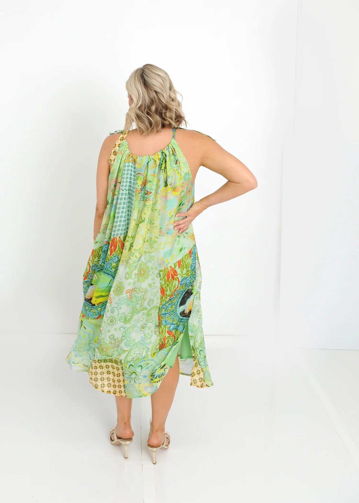 This vibrant green dress features a whimsical patchwork-style print with tropical and paisley-inspired designs. It has a soft halter neckline with adjustable tie straps for a flattering fit and flowy silhouette. The asymmetrical hem adds playful movement.