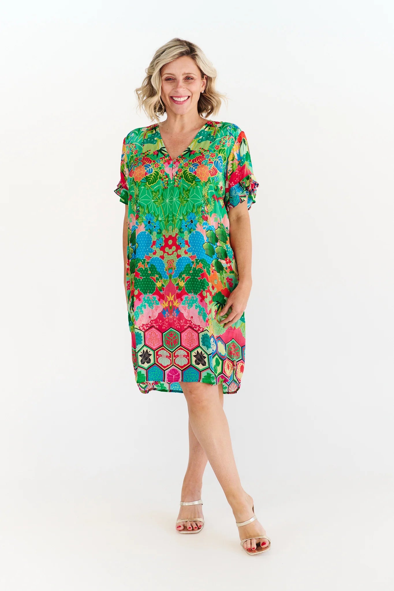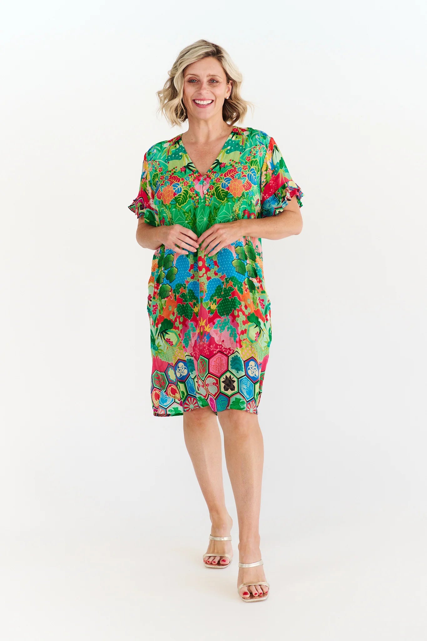 With a flattering V-neckline, playful ruffle sleeves and a knee-length silhouette, it’s the perfect throw-on-and-go piece for sunshine-filled days. The bold mix of florals and geometric motifs brings instant personality.