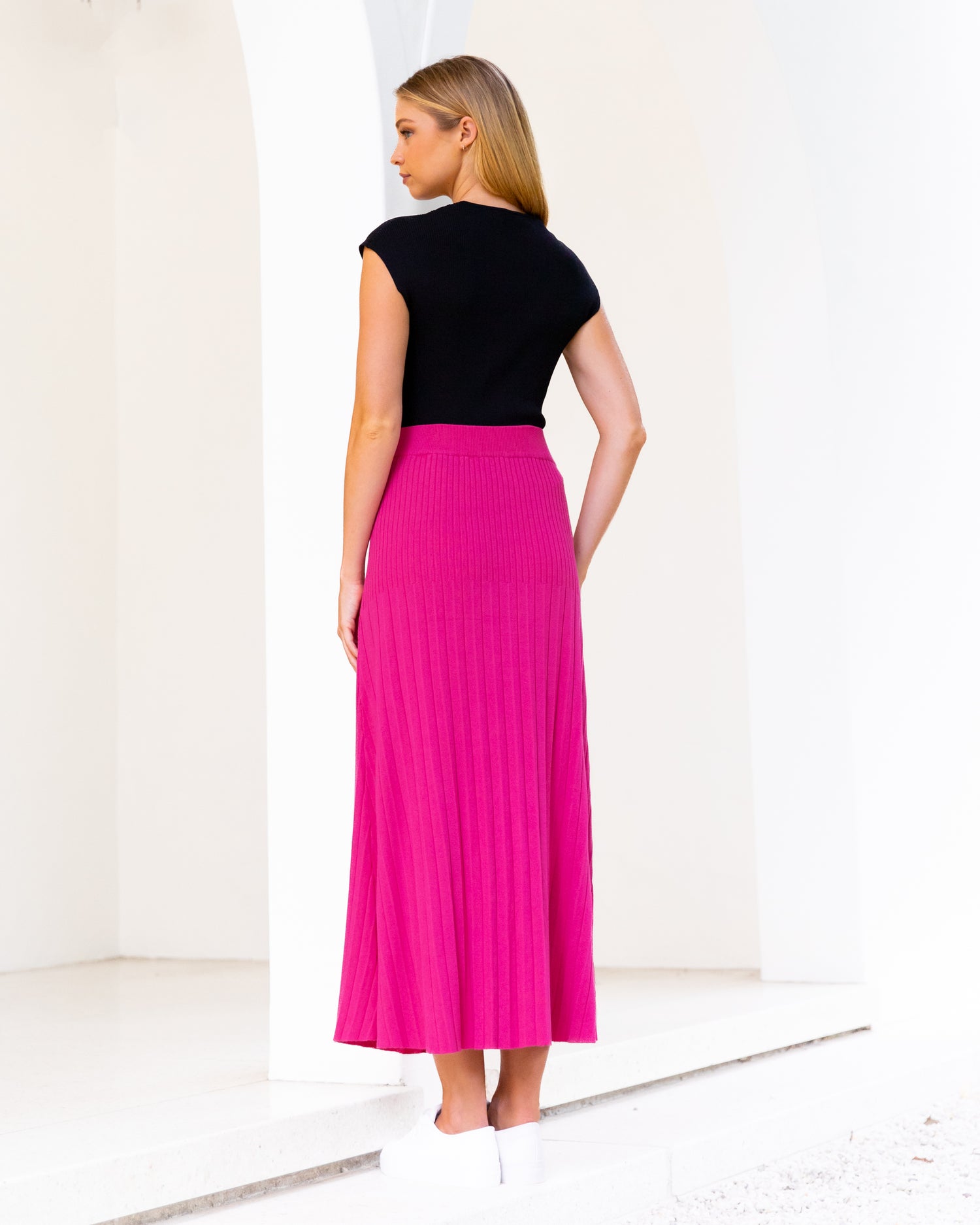 Made from a stretchy ribbed knit fabric, it pairs perfectly with skirts, trousers, or denim, effortlessly taking you from work to weekend.