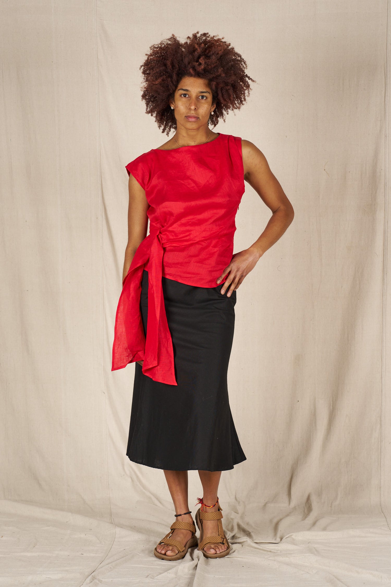 Summer top with asymmetrical shape and tie waist.