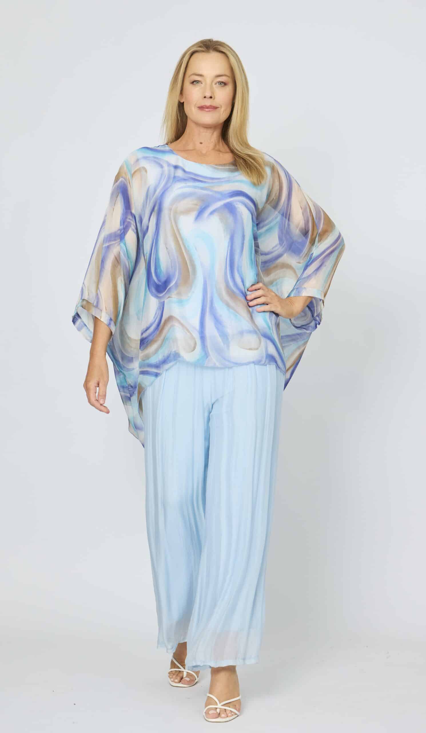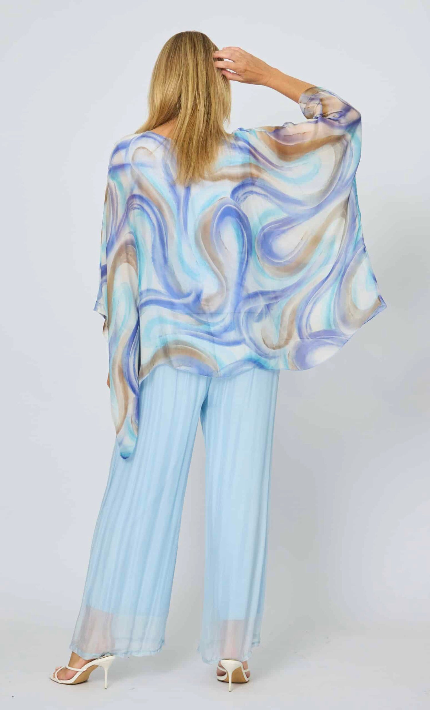 Silk kaftan top with a 1/2 sleeve and wide neckline. In sizes S to XL. Made in Italy. 70% SILK 30% VISCOSE
