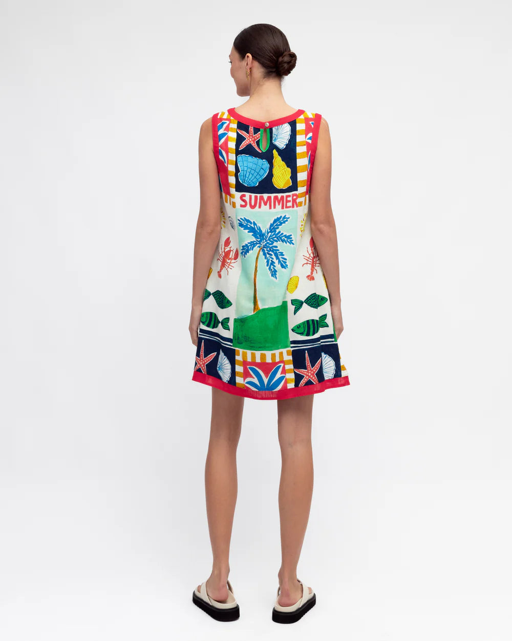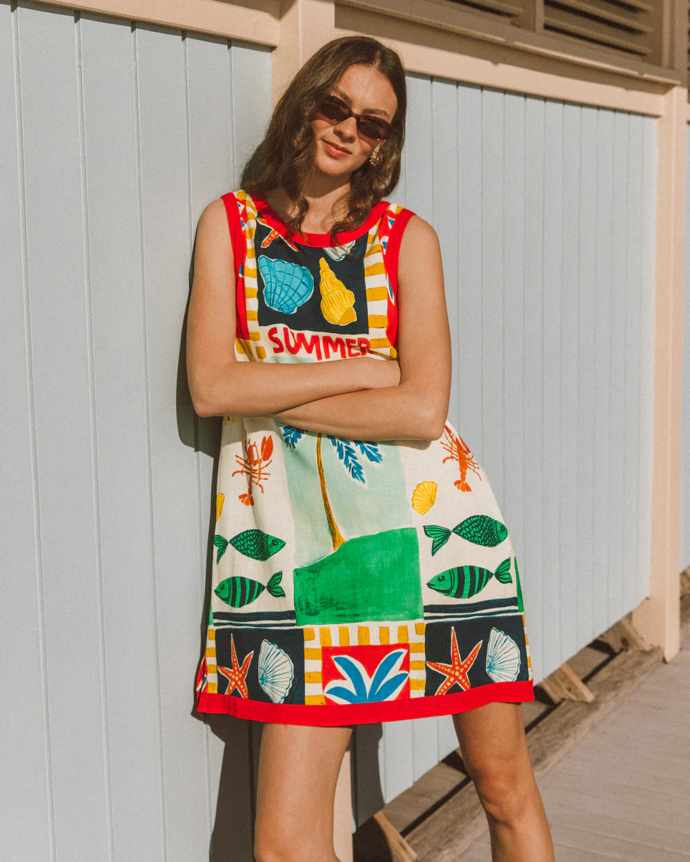 The Soleil Summer Short Dress blends vibrant summer style with breathable comfort, crafted from lightweight rayon linen ideal for warm days. Its colorful pattern captures the essence of summer, while the red-trimmed round neckline, sleeves, and hem add a polished touch. Practical side pockets enhance its versatility, making it a stylish yet functional choice for sunny outings.