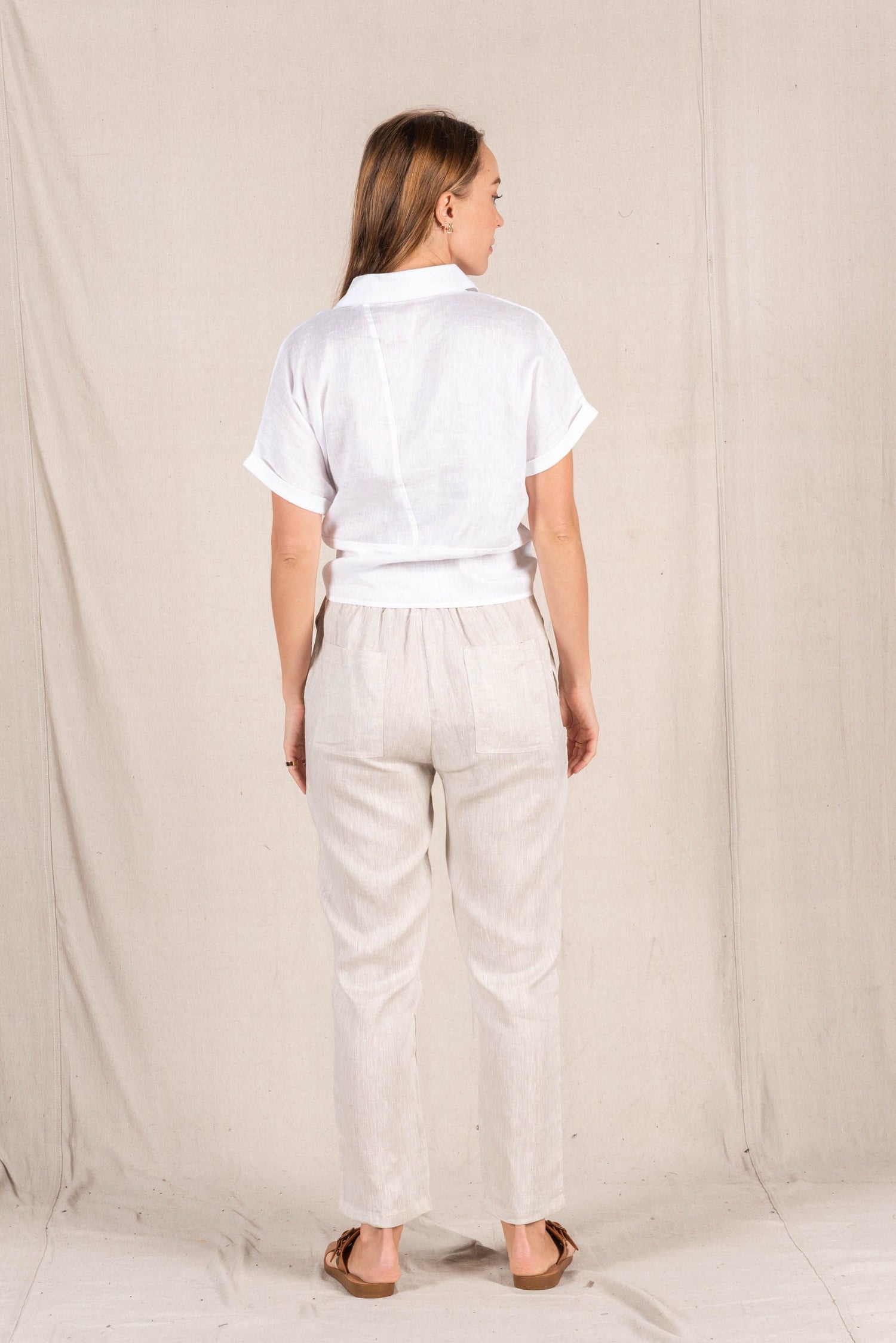 A lightweight linen shirt featuring a relaxed collar, short rolled sleeves and a flattering wrap-front tie that allows you to adjust the fit your way. Soft, breathable and effortless to style, it’s the perfect piece for warm days easy to dress up or down and ideal for layering through the seasons.
