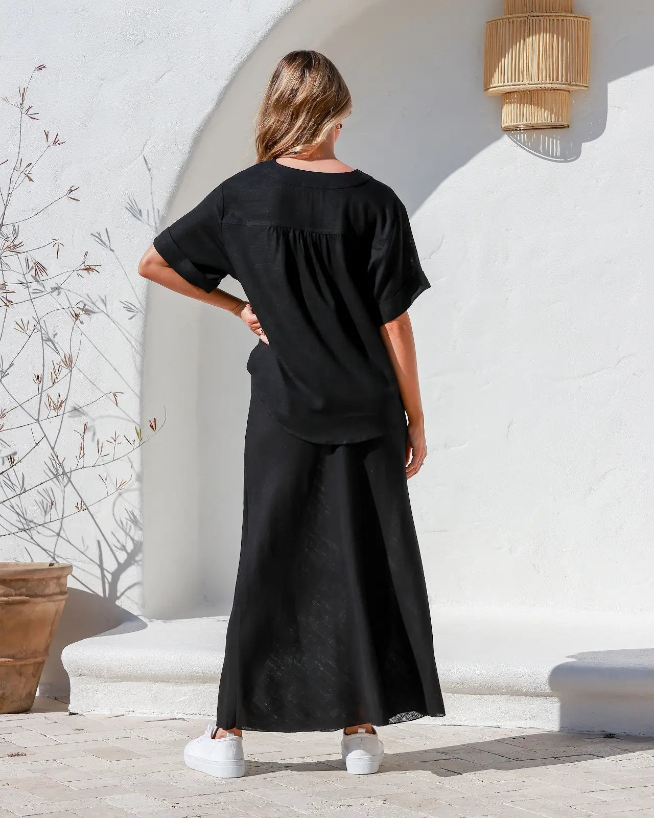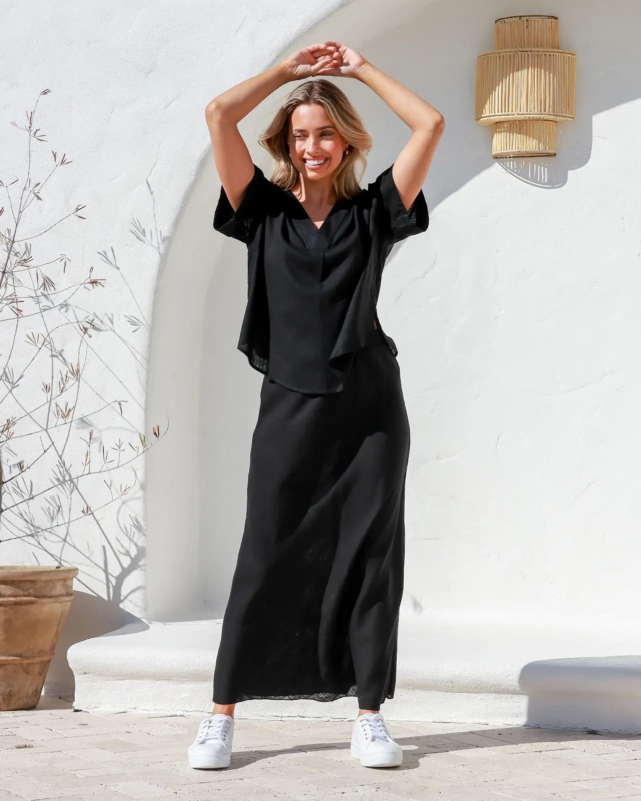 This top is made from a soft linen and viscose blend, perfect for everyday wear. It has a relaxed fit with short sleeves, a V-neckline, and small side splits for comfort. The back is slightly longer for an easy, flattering shape.